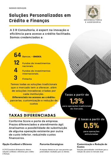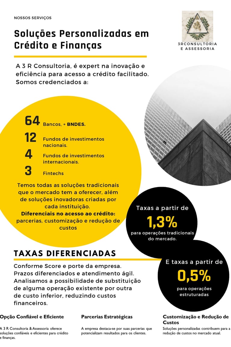 O acesso ao capital é o combustível de qualquer negócio. Na 3R Consultoria, somos especialistas em viabilizar o acesso a crédito de forma inteligente, rápida e personalizada. Diferente de uma abordagem genérica, analisamos o perfil de cada empresa para oferecer a melhor estrutura financeira disponível no mercado.