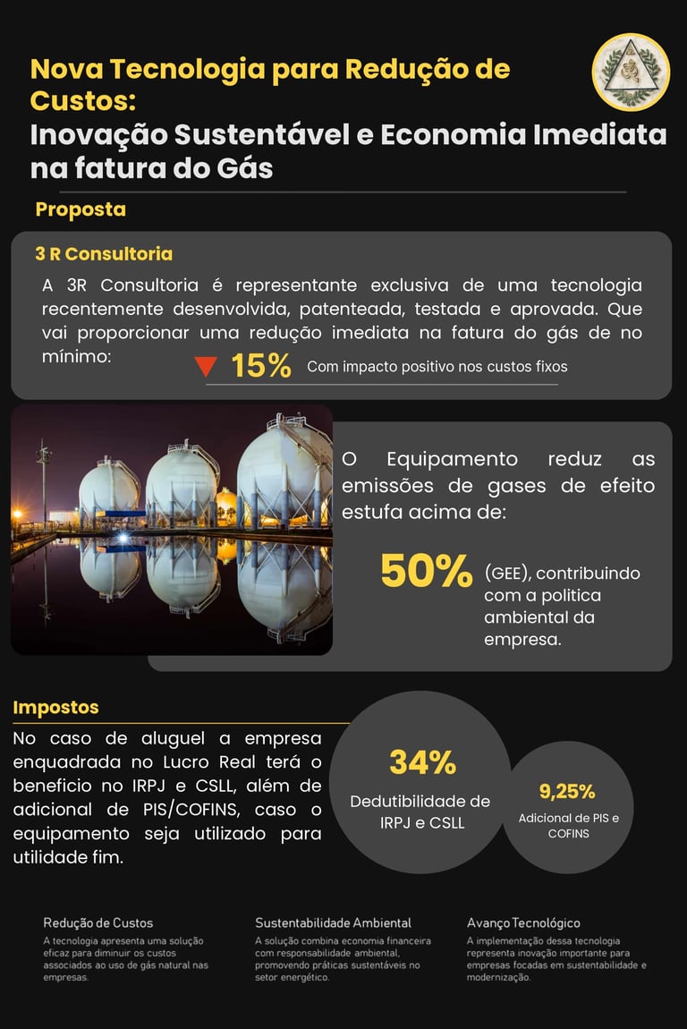 Inovação e sustentabilidade andam juntas na 3R Consultoria. Somos representantes exclusivos de uma tecnologia patenteada e testada, focada na redução drástica dos custos com gás natural.